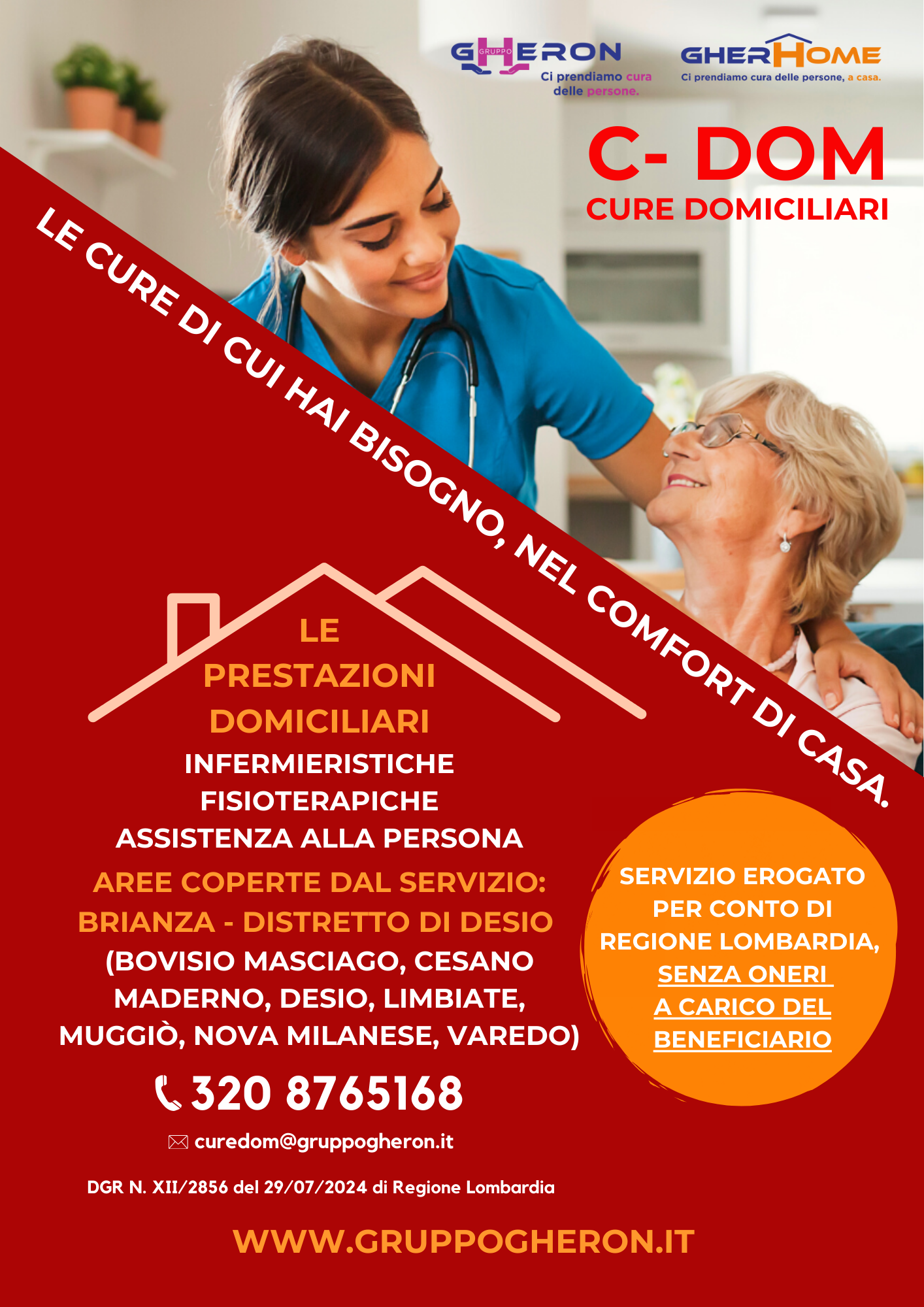 Da quest’autunno Gruppo Gheron, con la nuova divisione di cure domiciliari GHERHOME Baggio, è attivo sul territorio del Distretto di Desio.Le Cure Domiciliari prevedono prestazioni infermieristiche, fisioterapiche e di assistenza alla persona, senza costi per il paziente, a tutte le persone, a partire da 65 anni, in situazione di fragilità caratterizzata da bisogni sanitari e socio sanitari gestibili al domicilio, presenza di una condizione di non autosufficienza parziale o totale di carattere temporaneo o definitivo, di una condizione di non deambulabilità e non trasportabilità, di una rete familiare formale e informale di supporto o di condizioni abitative che garantiscano la praticabilità dell'assistenza.