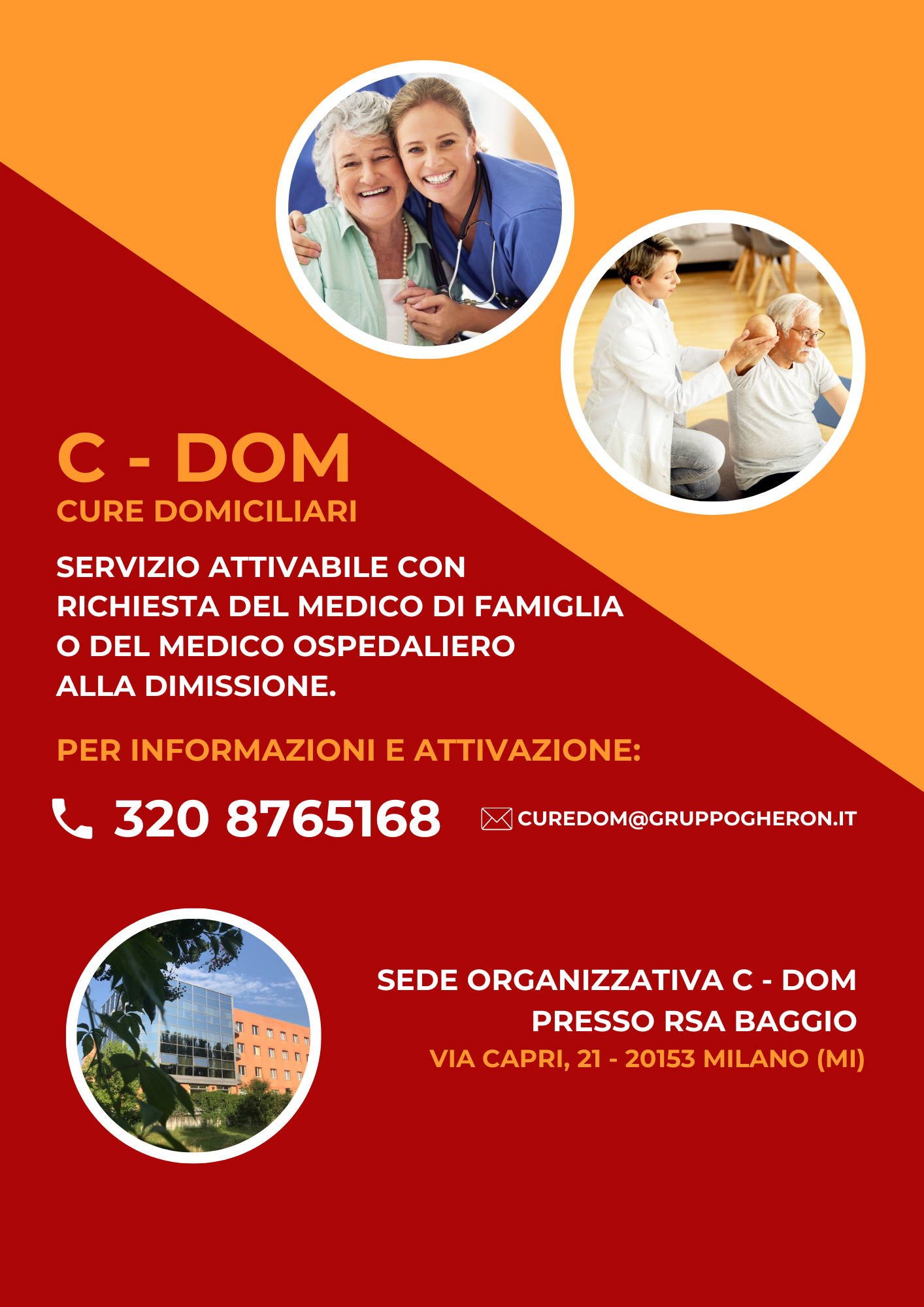 La sede organizzativa del nuovo servizio di Cure Domiciliari di Gruppo Gheron, per tutta la Lombardia, si trova a Milano, presso la RSA Baggio, in via Capri, 21.